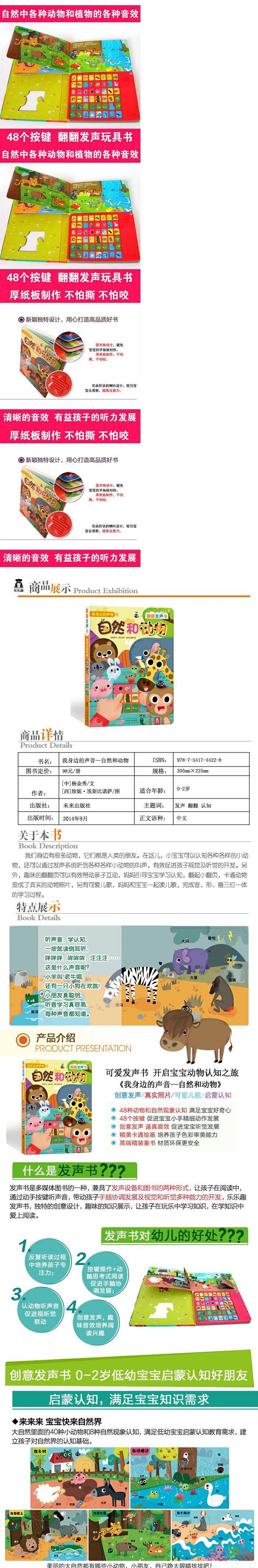 我们的身边有很多动物朋友,它们都是人类的朋友。认识它们,保护它们是我们每个小朋友都应该做到的事情。一起来听听它们的声音吧,你能分别出来吗?在小小的翻翻页下面还有这些动物的特点介绍哦~快来认识它们吧。看到书里的小翻页了吗,把它翻起来,咦,卡通动物变成了真实动物的照片,原来真实的他们长这个样子。再根据卡通图在发声板上找到相应的按钮,按一下,就能听到动物的叫声啦!书中有48种不同的声音哦,快来听一听,认一认。