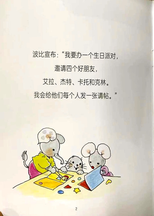 波比宣布:“我要办一个生日派对 邀请四个好朋友艾拉、杰特、卡托和克林我会给他们每个人发一张请帖。