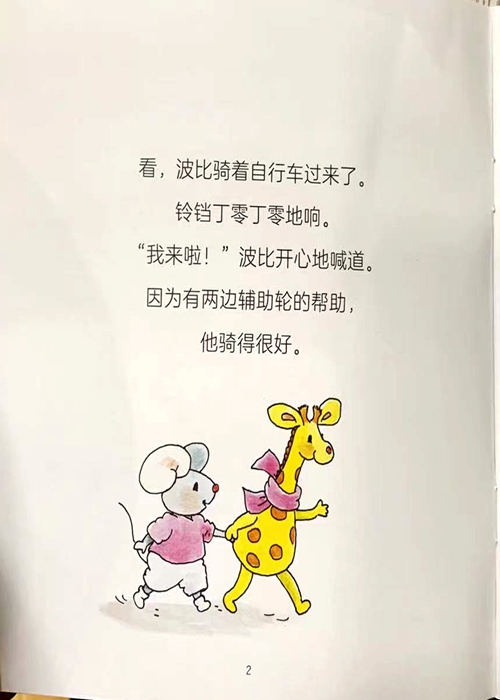 看,波比骑着自行车过来了 铃铛丁零丁零地响。 我来啦!”波比开心地喊道因为有两边辅助轮的帮助 他骑得很好。
