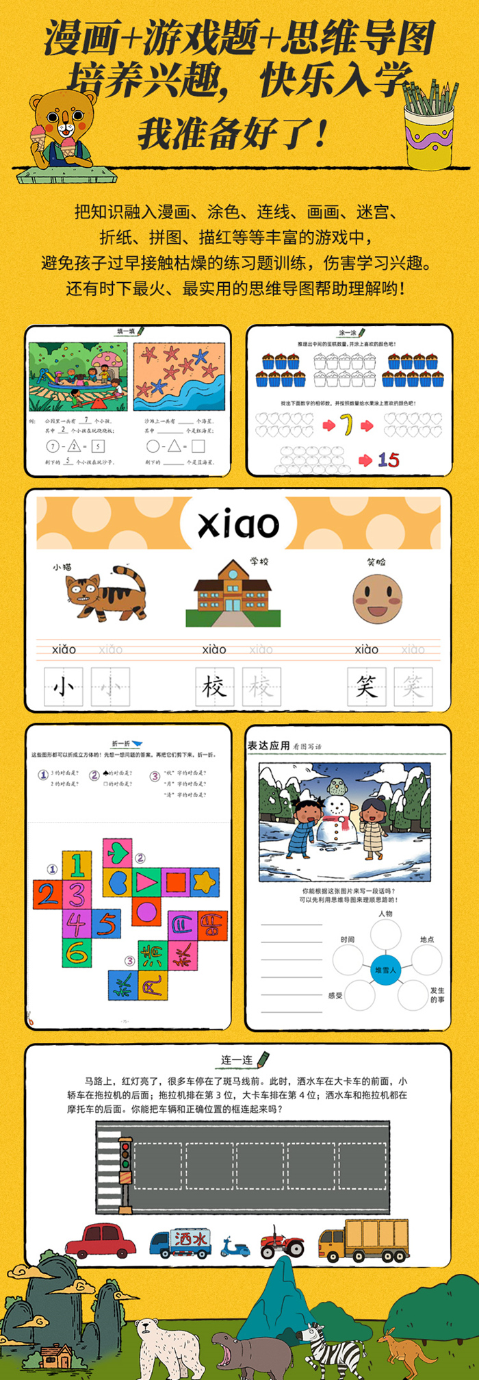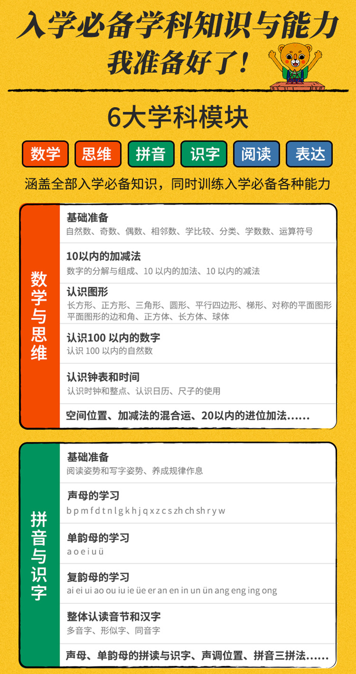 为处于幼小衔接阶段的孩子研发的读物,涵盖数学与思维、拼音与识字、阅读与表达、心理与习惯四个维度。不仅有必备的学科知识启蒙,更有非常容易被忽视其实很重要的心理建设、自控力、社交和生活学习习惯的培养,全方位帮助孩子顺利度过幼小衔接阶段,更好更快地融入小学生活。拒绝揠苗助长式的“提前学习”,采用漫画 游戏题 思维导图的形式,让孩子轻松掌握知识,保护学习兴趣 。