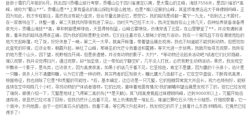 拯救小雪豹几年前的6月,我去四川贡嘎山旅行考察,贡嘎山位于四川省康定以南,是大雪山的主峰,海拔7556米,是四川省的*高峰,被称为“蜀山**”。贡嘎山是**上享有盛名的高山探险和登山胜地,也是*难以征服的山峰,其登顶难度远远大于珠穆朗玛峰。正因为如此,我才专程前往,虽然我没有能力登顶,但会尽量去接近它,感受它。我的路线是成都一冕宁一九龙,*后到达上木居村,在一家客栈住下,休整一番,第二天就找向导领我进了深山,当时天气已经不太冷,我决定独自在山上待几天,各种给养装备准备得很充分。贡嘎山海拔**高,草和树都是鲜绿色,天显得特别蓝,山峰云雾缭绕,仿佛穿透了云层。在山里攀登了**,并没有遇到游客,看来我的路线选得很正确。因为我的目标是野生动物,它们往往喜欢在人烟稀少的地方活动。我在一个背风且不存在滑坡危险的地方支起帐篷,吃了饭,好好休息了一晚。第二天一大早,就离开帐篷,带着望远镜去观测。我也不知道能不能找到动物,但感觉如此蛮荒的环境,应该会有。朝霞升起,映红了山峰,那神圣的光芒令我着迷和震撼。等天光进一步放亮,我就开始寻觅观察。我所在的地方是个山头,四下望,视野相当开阔。但是很遗憾,并没有动物的影子。大约*、*等动物还没起来活动吧?或者它们比较隐蔽,难以观察。我并没觉得扫兴,通过观察,却*加坚信,这一带如此宁静空旷,几乎没人打扰,必然有野生动物活动。果然,我发现空中飘来一个影子,是鸟类,应该很大,因为高度很高,如果小的话几乎看不见。它呈棕色,肯定不是鹰,因为鹰的个头很小,估计是一只雕。很多人分不清鹰和雕,认为它们是一种动物,其实两者的区别很大。雕比鹰大几倍都不止。它在空中盘旋,不断降低高度,根据特征,我也排除了它是*和秃鹫的可能性。*后,基本确定,这应该是一只兀鹫,它的翅膀异常宽大并且长,视力也特别好,能够连续在空中翔降几个小时,寻找动物的尸体或者猎物。它的出现,意味着地面有情况!我的眼睛和望远镜是发现不了的,但它已经发现了端倪。顺便介绍一下,兀鹫是地球上飞得第二高的鸟(**是天鹅),其飞翔高度竟超过珠穆朗玛峰,达到9000米以上。兀鹫开始迅速降低,很显然已经对准了目标,但我仍然什么也看不见,地上仿佛就是一堆乱石,难道它要吃石头?我十分疑惑,仔细观察着。它一个俯冲,扑向地面,由于一些较高石头的遮挡,我看不清,等它再次升起来时,我发现它的爪子上抓着什么东西!转瞬间,它竟然已经得手了!