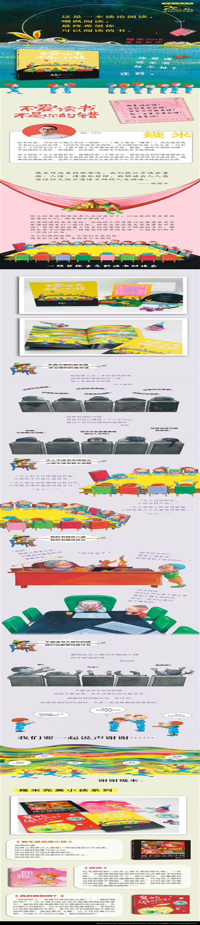 幾米,本名廖福彬,台湾知名绘本画家。1998年开始出版个人的绘本,开成人绘本创作之先,至今出版各式作品五十多种。作品被翻译成英、法、荷、西、葡、意、日、希腊、韩、泰、俄、波兰、爱沙尼亚、瑞典等多种语言,也与英国、美国、日本的出版社合作原创绘本。多部作品被改编成音乐剧、电视剧及电影,得过多座金鼎奖。他还获得比利时维塞勒青少年文学奖、西班牙教育文化体育部主办的出版奖之艺术类图书年度首奖、瑞典彼得潘银星奖,也入围林格伦纪念。