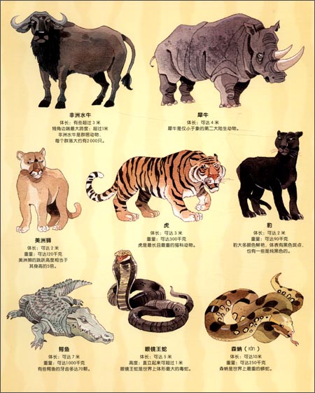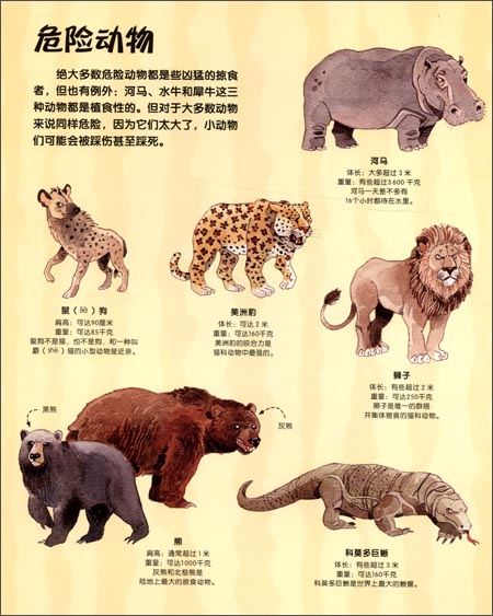 绝大多数危险动物都是些凶猛的掠食者,但也有例外:河马、水牛和犀牛这三种动物都是植食性的。但对于大多数动物来说同样危险,因为它们太大了,小动物们可能会被踩伤甚至踩死。