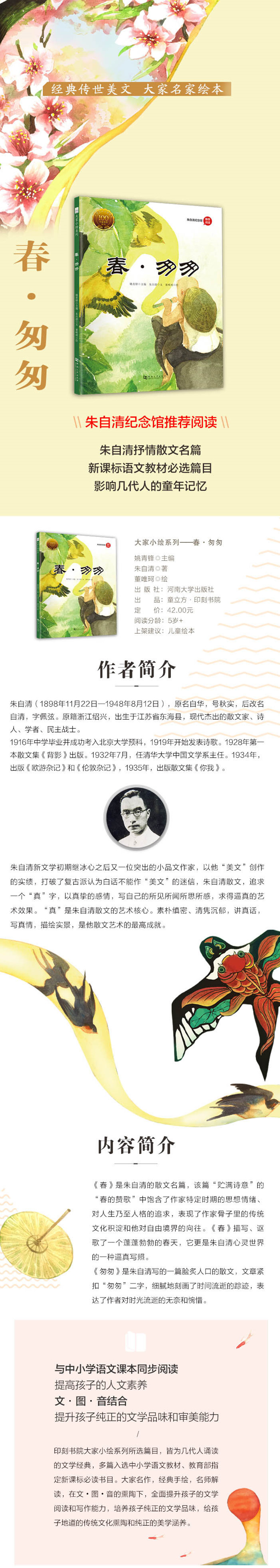 《春》是朱自清的散文名篇,该篇“贮满诗意”的“春的赞歌”中饱含了作家特定时期的思想情绪、对人生乃至人格的追求,表现了作家骨子里的传统文化积淀和他对自由境界的向往。《春》描写、讴歌了一个蓬蓬勃勃的春天,它更是朱自清心灵世界的一种逼真写照。 《匆匆》是朱自清写的一篇脍炙人口的散文,文章紧扣“匆匆”二字,细腻地刻画了时间流逝的踪迹,表达了作者对时光流逝的无奈和惋惜。