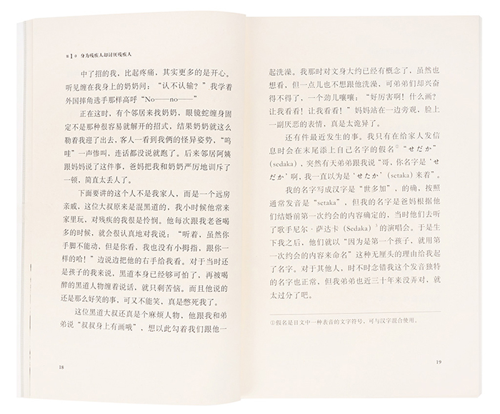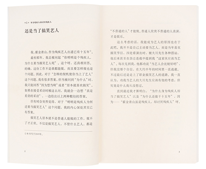 对作者霍金青山来说,一路走来,歧视如影随形。他患有先天性多发性关节挛缩症,一生下来就关节僵直、挛缩,手脚都无法伸缩。这种病一万人里约有一例,是名副其实的一级伤残。不过,“残疾”不是仅有的标签,他还是一名搞笑艺人。