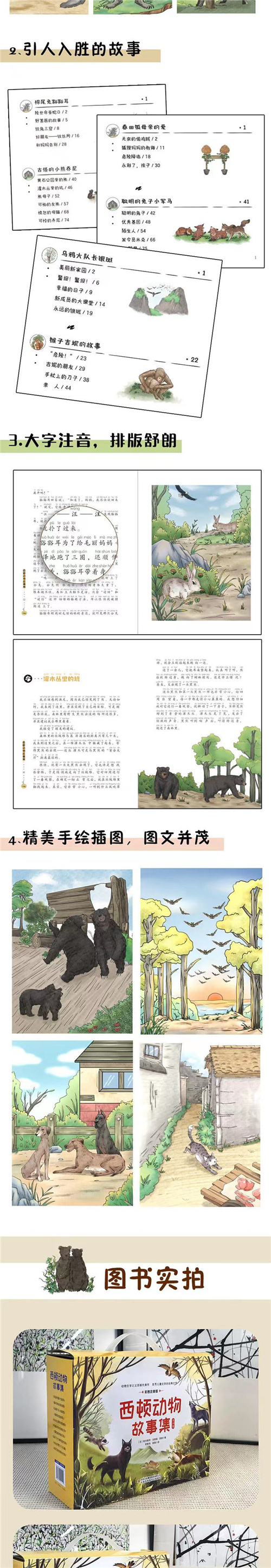 老约翰双语绘本馆~免费送书上门: 内容简介 《春田狐母亲的爱》 老家的母鸡接二连三地丢失,捕猎经验丰富的“我”负责追查凶手,经过分析锁定狐狸是凶手。“我”一路追踪,发现一只母狐狸带着小狐狸在村旁松树林里安了家。“我”经过一连几天观察,竟然发现母狐狸有着如此伟大的母爱,那份真挚的母爱深深触动了“我”。“我”打算怎样处理这一切呢? 《忠诚的爱犬宾果》 小狗宾果在主人意外被捕狼机夹住、身陷绝望之时,勇敢地拯救了主人,虽然它不是时时陪在主人身边,但它对主人的爱和忠心无可置疑。主人和宾果相互帮助和扶持,顺利渡过一次次危机。但这时,宾果身上发生了一件不幸的事…… 《棉尾兔豁豁耳》 豁豁耳从小和妈妈毛丽相依为命。豁豁耳小时候,毛丽教它生存的本领,聪明的豁豁耳学得很快,它们母子过得幸福又自由。在一个月黑风高的夜晚,危险来临了,睡梦中的它们被一只狐狸偷袭。毛丽在逃亡时游进河里被...... 老约翰双语绘本馆~免费送书上门: [文件]