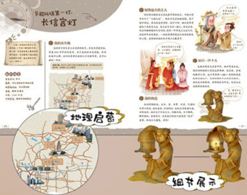 1.好玩。我们都说兴趣是最好的老师,但对于孩子们来说,什么是最好的兴趣呢?没有别的,就是好玩!好玩是激发孩子兴趣的第一步,在这套书里,国宝不再是冷冰冰的物件,默寂寂的摆设,而是一个个活灵活现的萌物。它们为了组成“中华之光”C位出道,使尽浑身解数介绍和宣传自己,为自己拉票,就是想进入代表中华文化大名单。 2.历史启蒙。每件国宝都是特定历史下的产物,它们身上沉淀和凝聚的都是当时社会和年代的历史细节。萌哒哒的国宝们为了拉投票,通过精心设计的开场白、档案隐私公告、个性飞扬的签名彰显自己的性格外,还活灵活现地跟小读者们讲了自己的家乡、时代、民族(族民)、主人、来历、工艺(或构造)、地位、意义等等,在历史拼图一片片拼起来的同时,启蒙就在趣味化的讲述中不知不觉完成了。 3.地理启蒙。每件国宝除特定历史原因外,也有其独特的地理环境要素。配合“我的家乡”或“出生地”简介,绘出符合小读者认知特色的简易版手绘地图,建立一个国宝出生地或家乡的方位感。