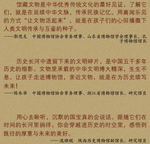 本套书按照史前至清代的历史时间顺序,选取具有代表性的文物如贾湖骨笛、越王勾践剑、曾侯乙编钟、杜虎符、秦铜车马、三彩骆驼载乐俑、钧窑月白釉出戟尊、翠玉白菜等40余种,以文物自己讲述亲历过往的方式,用生活化的场景和语言,带给孩子文物自身亲切本真的一面。精美的手绘插图,高度还原国宝外观,用卡通形象,拉近传统意义上古板的文物与孩子们的距离,让孩子在加深对文物了解的同时,与国宝对话,走进历史和古时人们的生活,从而对凝结着思想价值的文物心存敬意,增加对美的感知,亲近并爱上博大精深的中国文化。 地理范围广,知识面广,包含国内多个省份博物馆中的重要馆藏,在介绍文物知识的同时,介绍当时的历史故事、名人小传,造字由来等。 趣味性高。语言生动幽默,在介绍知识的同时融会贯通了大量历史故事,可读性强。有益提升孩子对历史、文学、美学等方面的兴趣。