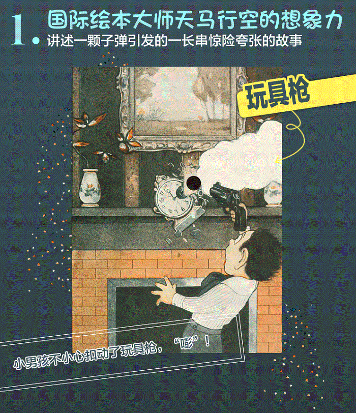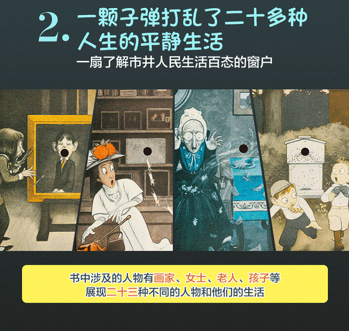 这本书讲述了一颗子弹横冲直撞地引发了一系列的意外事件。一颗子弹,射穿了做饭人的锅炉房,热气腾腾的蒸汽四处扩散;弄断了秋千绳,小女孩摔倒地上;射穿汽车的油箱,汽车爆炸;射穿画家的画作,画中男孩从微笑变成了惊愕;射穿了鱼缸,鱼儿在老奶奶的裙子里挣扎;射穿了宠物店的小鼠盒子,老鼠呲溜全跑出来;一个望着墙内梨树垂涎三尺的小男孩,撞断了树枝,梨子正好掉到小男孩怀里。