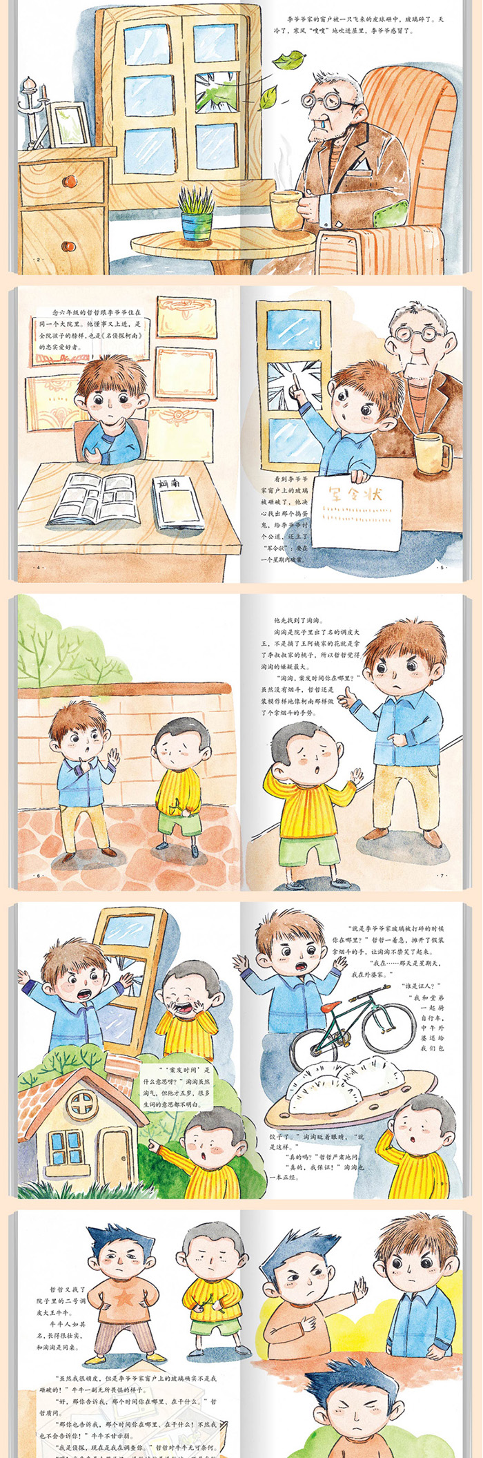 这是一本儿童图画故事书。一天,李爷爷家的窗户被一只飞来的皮球砸中,玻璃碎了。院里的“小侦探”哲哲为了“破案”展开了一番调查。先后找来了淘淘、牛牛、淡淡进行谈话,了解了当时他们几个人分别在哪里,然后进行了细致的分析,终于找到了“作案者”。