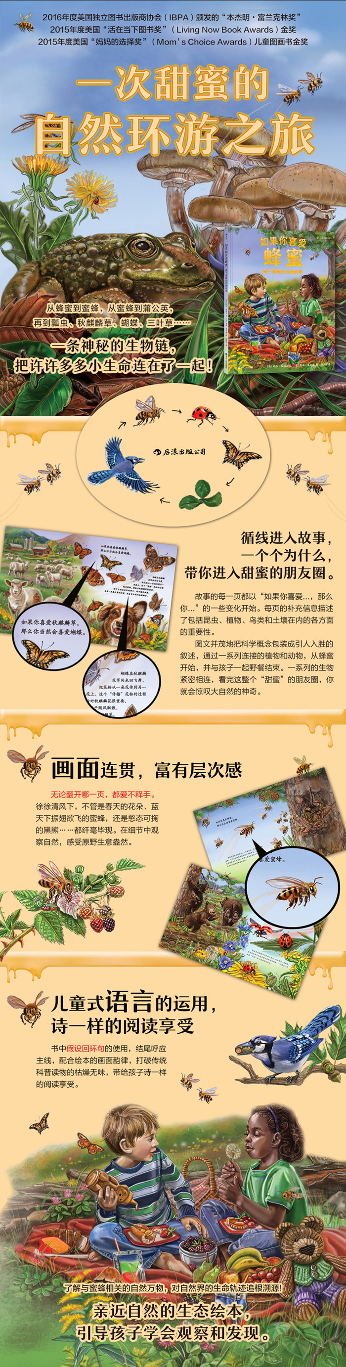 本书从蜂蜜讲到蜜蜂,再讲到蒲公英,然后再谈到在蒲公英上吃害虫的瓢虫,秋麒麟草、蝴蝶、三叶草……顺着自然界的生命轨迹,层层延展,追根溯源。本书将引领孩子了解蜜蜂授粉和蜂蜜制造的整个过程,同时也为老师和家长们提供了丰富的科普知识。