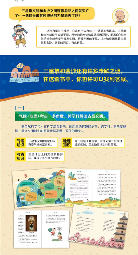“沉睡三千年,一醒惊天下。”随着三星堆遗址的最新考古发掘进展陆续公布,围绕三星堆“上新”文物与有关三星堆文明未解之谜的热议持续高涨。本书由地质学教授、史前考古学研究员、著名科普作家刘兴诗创作。全书把自然科学和人文科学结合起来,通过生动有趣的语言,跨学科角度解读三星堆文明,探寻古蜀人的气候、饮食、居住、劳作、迁徙等生活片段,发掘其中隐藏的科学知识和中华文明精神,解说生动,思想包容。