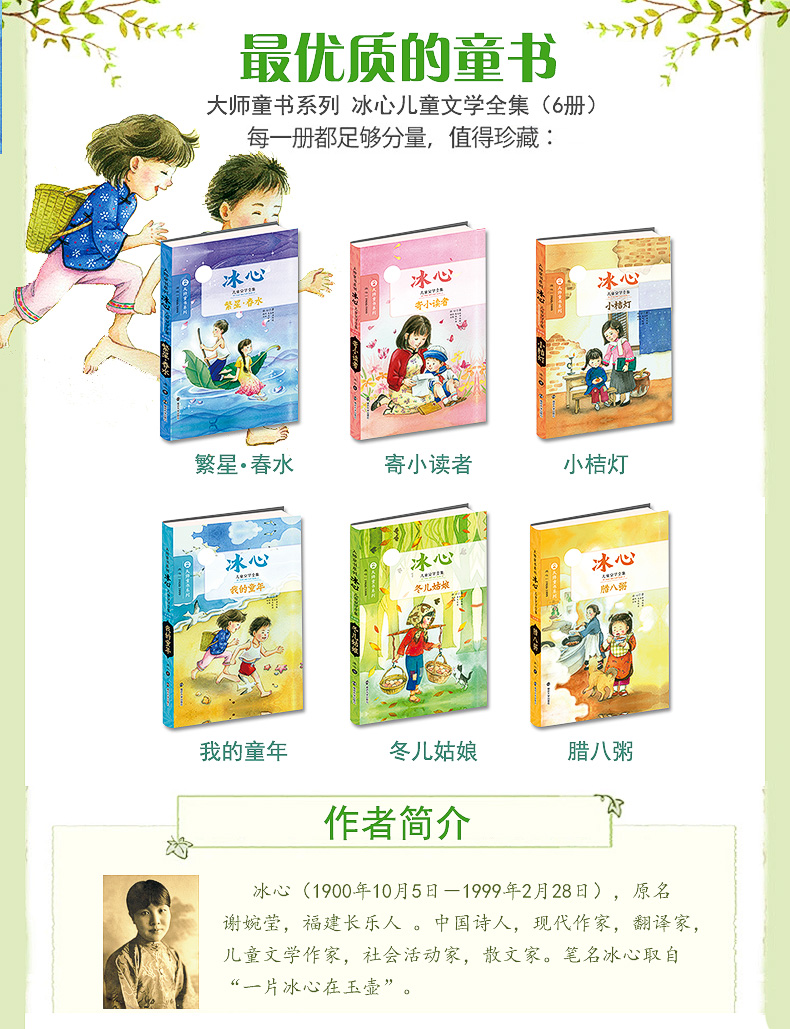 《寄小读者》是著名女作家冰心写给小读者的通讯录,主要记叙了作者离开家乡,远渡重洋,在异国他乡的生活,抒发了心中的眷恋、思念和感伤之情,其中浸润着浓厚的母爱,手足之情,友情和乡愁。真挚诚恳,缱绻悱恻的文字,涵盖了关于人生、亲情、友情、感恩、审美、励志、成长、成功等多个方面,影响了近一个世纪青少年的成长,堪称*国现代儿童文学的奠基之作。
