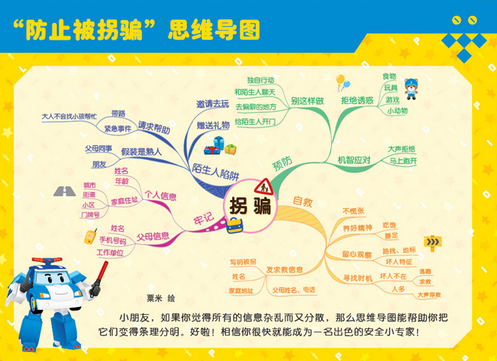 “儿童安全避险故事书”全书10册,涉及预防被拐骗、交通出行、遇险如何报警、受伤自救、火海逃生以及野外迷路求生等家长密切关注的多个安全教育主题。这些主题能够帮助孩子提高安全意识,学会认知危险、避让危险,以及身处险境时如何有效自救、求救。为保证知识的准确性,我们邀请了来自北京协和医院急诊科、中国消防博物馆、中国地震局等多个权威机构的专家,对内容进行了审定,家长可以放心阅读。更值得一提的是,每册书后均附有一张思维导图,这不仅能够帮助孩子快速记住安全要点,还能在潜移默化中引导孩子形成清晰的逻辑思维和高度的概括能力。相信这些细节会为良好的亲子阅读助力。