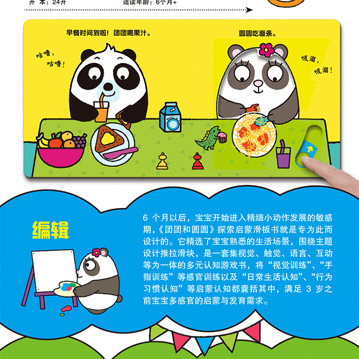 6个月以后,宝宝开始进入精细小动作发展的敏感期,《团团和圆圆》探索启蒙滑板书就是专为此而设计的。它精选了宝宝熟悉的生活场景,围绕主题设计推拉滑块,是一套集视觉、触觉、语言、互动等为一体的多元认知游戏书,将“视觉训练”、“手指训练”等感官训练以及“日常生活认知”、“行为习惯认知”等启蒙认知都囊括其中,满足3岁之前宝宝多感官的启蒙与发育需求。