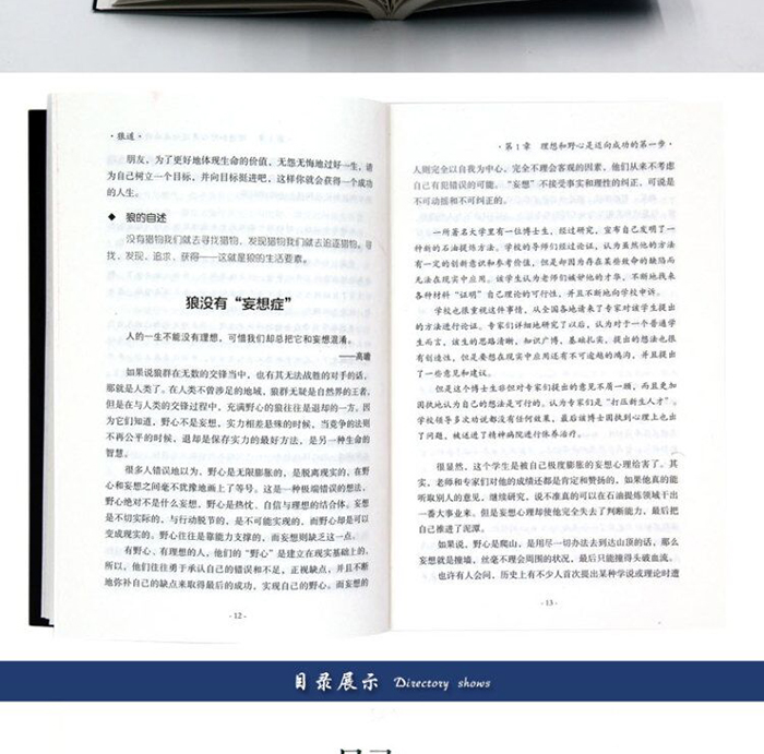 《狼道》本书通过对狼的优秀素质和卓越精神的深入剖析,揭示了--在残酷的社会竞争中,一个人如果拥有狼的这种素质,则他强大的力量足以令任何对手恐惧,取得令人瞩目的成功;一个团队如果具有了狼的这种精神,那它将无往而不胜,创造出巨大的辉煌。无论工作还是学习在本书中都可以得到有益的提升,尤其是在团队合作方面。