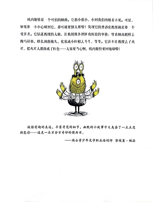 欧内斯特是一个可怕的细菌。它很小很小,小到我们肉眼看不见。可是,如果谁一不小心碰到它,那可就要倒大霉啦!发现它的普洛克教授就是第一个受害者。它钻进教授的大脑,让教授做各种匪夷所思的事情:穿着细高跟鞋去跑马拉松、给长颈鹿梳头、化装成小红帽去斗牛,等等。它甚至让教授去了火星,把火星人都涂成了红色……大家要当心啊,欧内斯特要回地球啦!