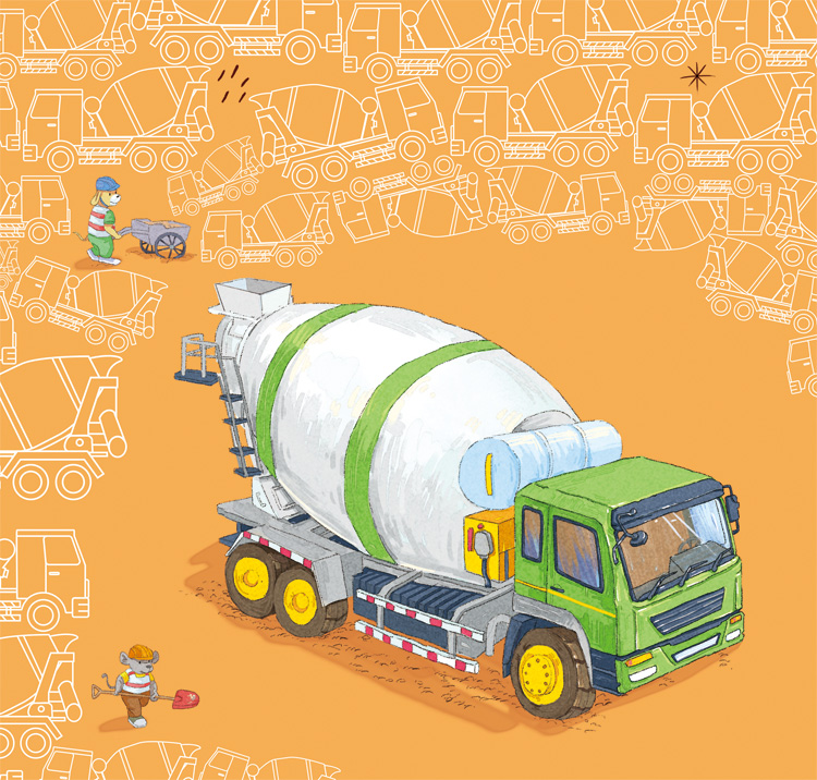 《搅拌车,辛苦了!》一书,从一个清晨的混凝土搅拌站开始,讲述了搅拌车从装载混凝土,运输混凝土,到达工地后卸载混凝土的整个过程。在此过程中,故事用堵车时搅拌车着急的心理,以及不同转动的搅拌罐传达了混凝土可能会因为长时间的运输而存在凝固的风险。故事通过装载和卸载混凝土的文字表述以及写实的场景插画,还原了搅拌车及其配套设备的工作原理。