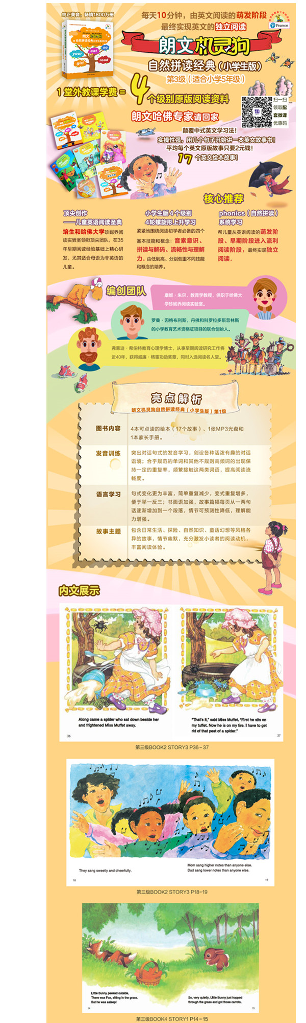 朗文携手哈佛20年研发成果!自然拼读必读!实操性强,从短句过渡到长句的发音学习!每天10分钟,由英文阅读的萌发阶段,*终实现英文独立阅读19个可点读的英文绘本故事!以简单句为主,逐步增加否定句、疑问句等,但句式结构重复出现确保孩子的理解和记忆纯正美音,全球畅销1800万册1堂外教课学费=机灵狗阅读资料图画精美,画风多变,区别于粗制滥造的分级英语阅读!Word Study帮助孩子总结重点,家长手册深入阅读指导