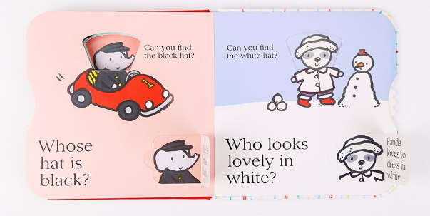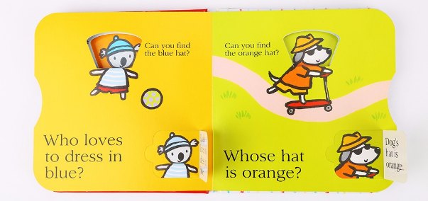 底部会有提问“Whose hat is...?” 翻开问号小页,就会出现正确的图像和答案。这样学习认知颜色,是不是更好玩了呢?