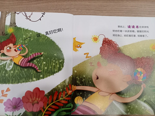 草地上,波波米在津津有味地吃着一块波波糖。暖暖的阳光照在身上,她吃着吃着,就睡着了。