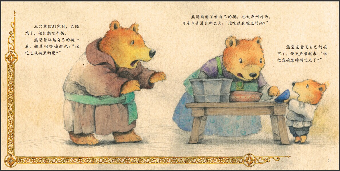 一个迷路的小姑娘闯进了三只熊的家里,把三只熊家搞得一团糟。当三只熊回到家里时,小姑娘却逃跑啦!通过故事,能感受到的是三只熊的憨直与糊里糊涂的小姑娘的可爱,真正体会到的是人与人相处的和谐与温馨。