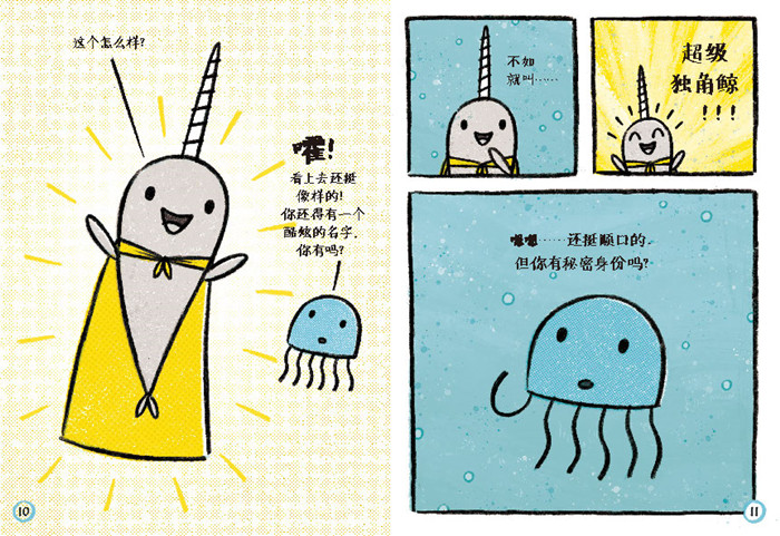 《花生酱大冒险》:在这本书中,独角鯨遇到了挚爱美食花生酱,并围绕花生酱展开了一系列别开生面的冒险经历包括给自己改名字、与水母合作编写漫画故事以及变身超小独角鲸等。作者借用十分讨喜的独角鲸形象,向读者展示了欢乐的友谊和“在一起”的美好生活。