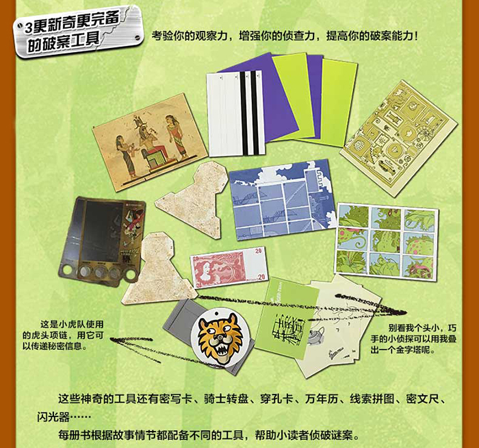 孩子只有6岁,每天给他读一小点,欲罢不能,情节环环紧扣。随书的破案工具,也能引起孩子对书的兴趣。可能小学1年级以上的孩子读,更有利于培养观察力与推理能力。