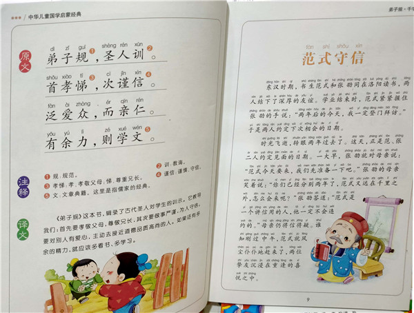 《弟子规》和《千字文》都是经典启蒙读物。《弟子规》以儒家的忠孝思想为主线,教育孩子从小懂礼貌、讲信用、孝顺父母、尊敬师长、与兄弟姐妹和睦相处、与人平等相处等,培养他们良好的生活和行为习惯。全文语言接近白话,易记好懂,韵味十足,朗朗上口。《千字文》是我国使用时间最久、影响*的识字课本之一,全书从自然万象及人类早期的历史讲起,在短短的篇幅中涵盖了天文、地理、历史、气象等多方面的知识;而且全篇没有重复的字,在形式上四字一句,对偶押韵,便于记诵。