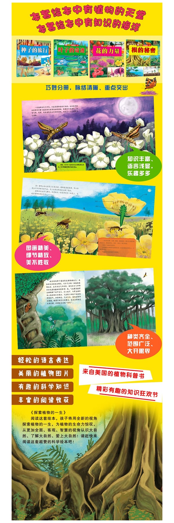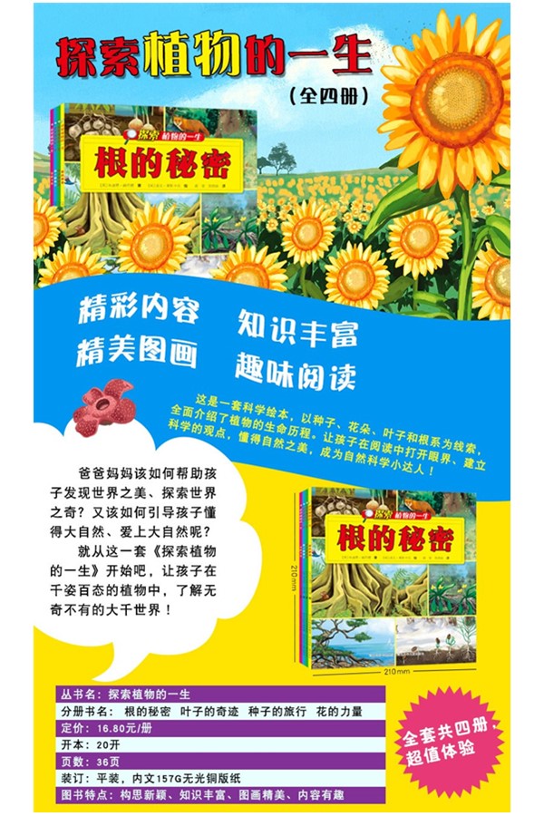 这套书共4本,以种子、花朵、叶子和根系为线索,全面介绍植物的生命历程,带领孩子进入奇妙的植物世界,让孩子对植物充满探索的兴趣,从此深切地爱上大自然。