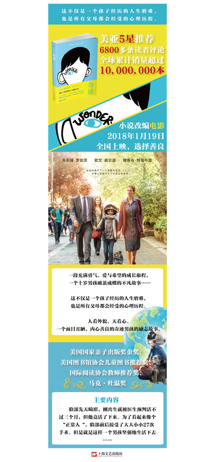 奥吉是一个普通却又不普通的男孩。因为有着一张不普通的脸,十岁之前的他从未上过学。但是,十岁这一年,父母为奥吉精心挑选了一所学校——毕彻中学。自此,奥吉开始了异常艰辛的校园生活。他如何与校长图什曼先生、各个科目的老师,以及性格迥异的同学们相处?上学之后的他与家人之间的关系又有何新的挑战?在人群以及各种各样意想不到的冲突中,他该如何往前?