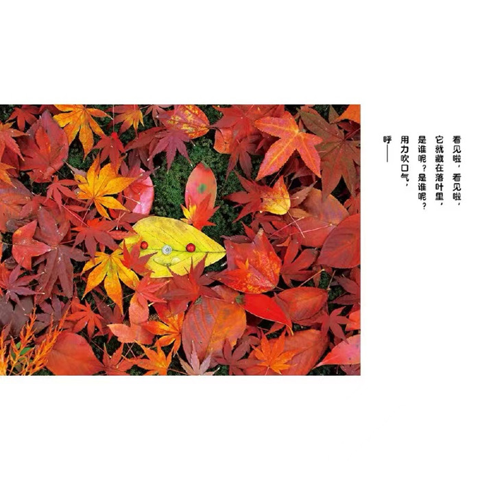 不同的颜色、不同的形状,各式各样的落叶。落叶里藏了哪些“动物”呢? 落叶中是谁呢?是谁呢?是有人藏在那里吧。把叶子掀开看一看吧。原来是狸猫呀。 落叶中是谁呢?是谁呢?是有人藏在那里吧。把叶子掀开看一看吧。原来是兔子呀。 落叶中是谁呢?是谁呢?是有人藏在那里吧。把叶子掀开看一看吧。原来是猪呀。 落叶中是谁呢?是谁呢?是有人藏在那里吧。把叶子掀开看一看吧。原来是狮子呀。 落叶中是谁呢?是谁呢?是有人藏在那里吧。把叶子掀开看一看吧。原来是“大怪兽”呀。 已经没人了吗?再最后一次掀开看看吧。原来最后还有一只金鱼呀。