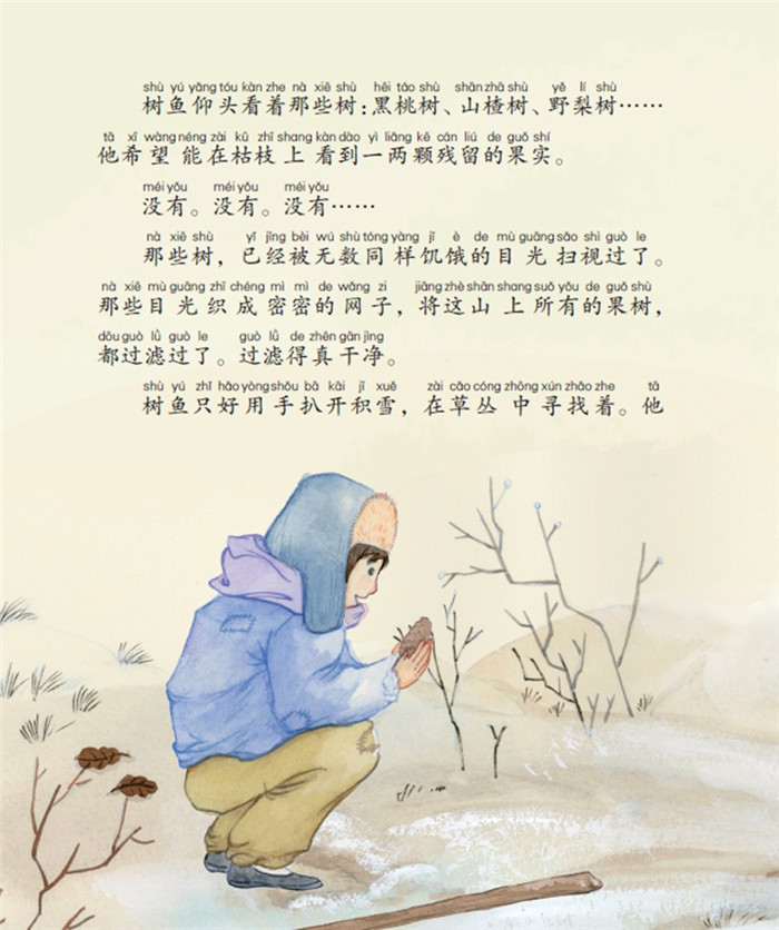 村里闹饥荒,树鱼去被雪覆盖的后山找吃的。好不容易找到一棵挂满柿子的树,他听到了来找他的对头丘石儿的呼唤声。一开始,他决定独享这棵树,但*后还是把大家引到了树那里。柿子不够分,他们商定只看不吃。一个晚上,树鱼实在忍不住,跑去后山想偷柿子,却意外看到了同样想偷柿子的桐子。丘石儿一家要去西边乞讨了,临行前,树鱼带着孩子们摘了一颗柿子,送给丘石儿。而剩下的三十五颗柿子,谁也没有摘……