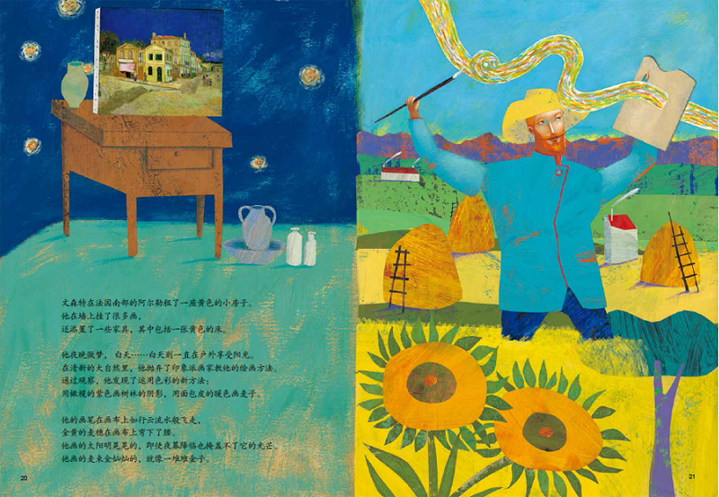 在《追逐色彩的梵高》中,作者从梵高写给弟弟提奥的信中得到灵感,娓娓道来印象派大师梵高追寻自我的一生,以及他与弟弟提奥亲密深厚的兄弟感情。在《梦想家达芬奇》中,透过鬼灵精怪的学徒贾克莫来了解这位天才博学家达芬奇……以独特的视角让孩子探触到这些伟大的艺术家灵魂。