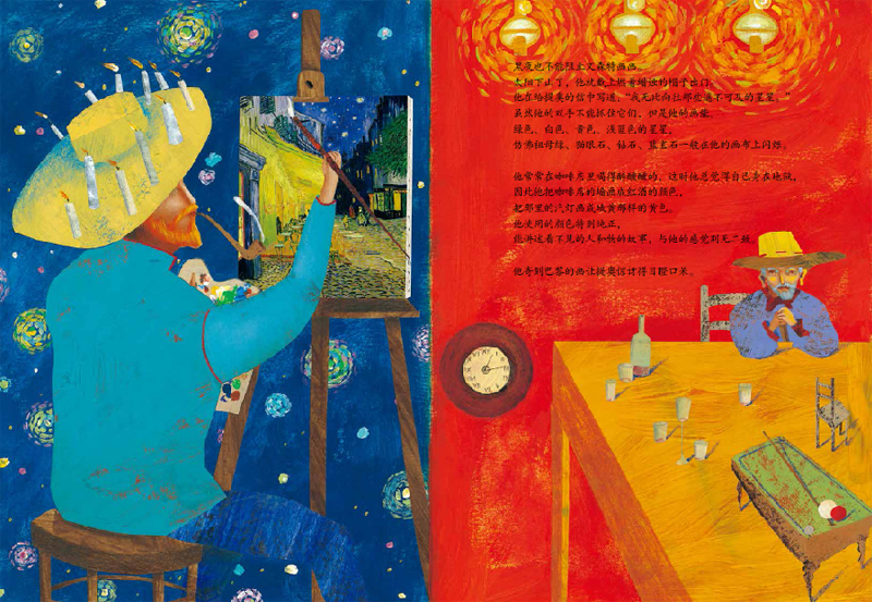 每本书的图画是根据各个艺术家的绘画风格而创作的,有些用画、有些用粘贴,细腻精致,呈现艺术大师坚持追求艺术的浓烈情感,让插图变成了艺术品。艺术家的代表作被巧妙地嵌进图画里,展现了绘者本身的美术造诣。家长在跟孩子看的时候不仅可以讲故事,也可以让孩子从画风上体会,感受艺术家伟大的人格魅力,得到艺术的熏陶,就像上了一堂艺术课。