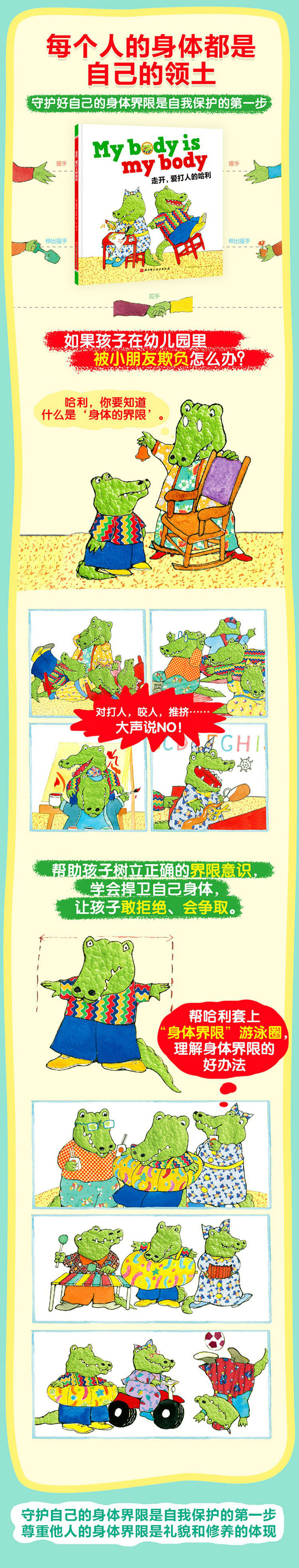 哈利是个淘气的小朋友,他因为不理解什么是“身体界限”不断与同学发生冲突,干扰其他的小朋友做事情,扰乱课堂秩序。面对哈利这个淘气的同学,幼儿园的孩子们大胆勇敢地发出了捍卫自己身体界限的声音,并用游戏的方式(戴游泳圈)帮助哈利认识了什么是“身体界限”,强化了他的规则意识。