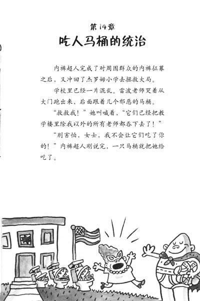在这本《内裤超人与吃人马桶》中,乔治与哈洛惹上的麻烦真的大得不得了,差点让整个星球毁在一群恶魔手里。他们不小心把漫画中的吃人马桶变活了,幸好,内裤超人发挥神功,给马桶们喂了好多学校食堂的饭,让马桶们把吃掉的人和东西都吐了出来。