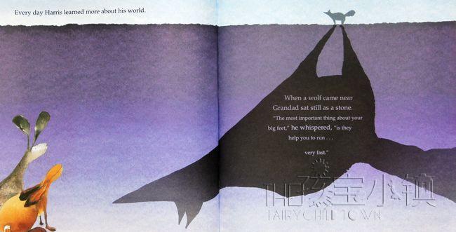 爷爷带着哈里在草原上轻轻一跳,一双大脚ㄚ就这么带着哈里蹦入了好高好高的空中! 大脚ㄚ还可以带着哈里攀上世界最陡最陡的高峰! 就算遇到了恐怖的大野狼也一点都不用害怕! 因为大脚ㄚ可以帮哈里跑得很快、很快,谁也追不上!
