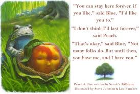 "...this old-fashioned tale of friendship radiates warmth and authenticity. One day Blue discovers Peach weeping up in a tree, longing to see the world beyond her branch. Forming a tower of toads, Blue and his siblings rescue her. As she drinks in the sights of the pond, Peach opens Blue's eyes to the beauty of the world that he takes for granted. In a bittersweet ending, Blue brings water and a willow branch dripping with tree milk to a peaked Peach, He tells her she can stay there forever, and Peach says she doesn't think she'll last forever. Blue replies, 'That's okay. Not many folks do. But until then, you have me, and I have you.' The generosity and mutual respect of these two characters serve as a wise reminder of what makes friendship prosper. Johnson and Fancher acknowledge the fantastic story line with lush, dreamy paints, while dodging the temptations of cuteness and condescension. In every respect, this is a standout title and particularly impressive as Kilborne's debut".