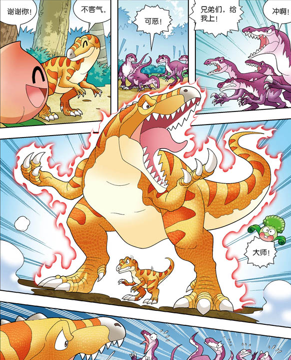 2、以多格漫画的形式,讲述植物与恐龙一起冒险的故事,情节跌宕起伏,引人入胜;知识点植入自然巧妙、不教条,且经过专家严格审订,难度适中,小读者在轻松读故事的同时,还能了解准确的恐龙知识。