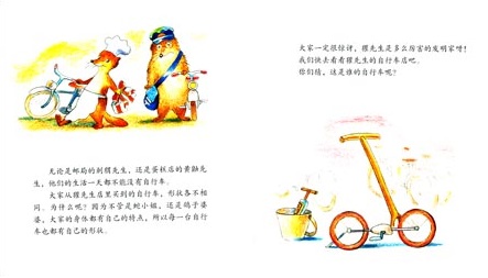 大家从獾先生店里买到的自行车,形状各不相同。为什么呢?因为不管是蛇小姐,还是鸽子婆婆,大家的身体都有自己的特点,所以每一台自行车也都有自己的形状。