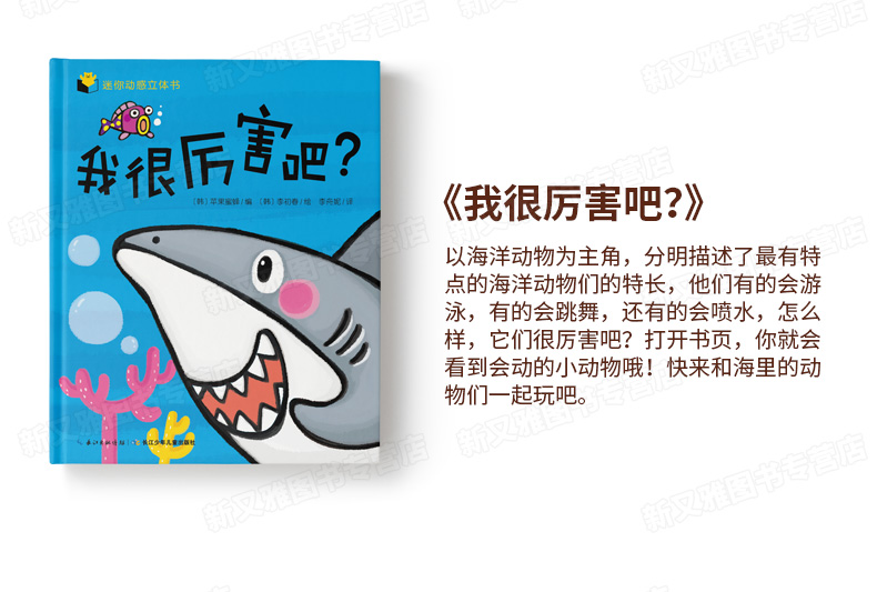 每一只海洋动物都有自己的特长。它们有的会游泳,有的会跳舞,还有的会喷水,怎么样,它们很厉害吧?打开书页,你就会看到会动的小动物哦!快来和海里的动物们一起玩吧