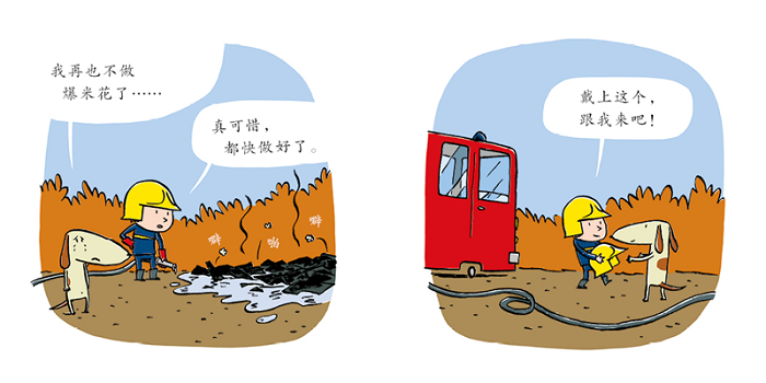 这是一个发生在勇敢的消防员和憨态可爱的小动物之间的有趣故事。消防员遇见了引起火灾的小狗和河狸,用专业的设备帮助它们解决了问题,在翻页过程中,孩子看到火灾的危害,会树立防范意识,还会被消防员的勇敢品质吸引,容易产生代入感。消防员以为家里着火了,原来是小动物为他准备的惊喜,还发生了点儿小意外!这个情节让孩子在哈哈大笑的同时,也感受和培养友爱、善良、互助的优秀品质!