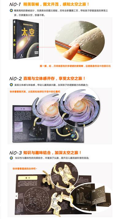 《太空》从星罗密布的地方启程,一直到达宇宙的边缘。本书含有多个立体形象,还有超立体的太阳系,拉拉式的彗星,月相,极为壮观的超新星爆炸图,这将是一场有趣又新奇的冒险。将带孩子进行一次宇宙之旅。而且书中各种有趣的互动方式:翻页、小册子、弹跳力体、拉拉页、纸艺立体模型等带我们追随着人类探索太空的足迹,走过一个个以现代和未来航空航天为主题的场景,体验波澜壮阔的太空旅程!在这里你可以置身浩渺宇宙,触摸那遥远而又神秘的星球,也可以翱翔天际,体验一场难忘的太空之旅!让孩子在进行宇宙之旅的同时,兴致盎然的探索太空的奥秘!宇宙中有什么?地球的结局会怎样?月球上有水吗?太阳系的行星各自有什么“秉性”?不同的恒星会经历怎样的演化历程?系外行星上有生命生存吗?等各种知识等待着小读者前来探索!