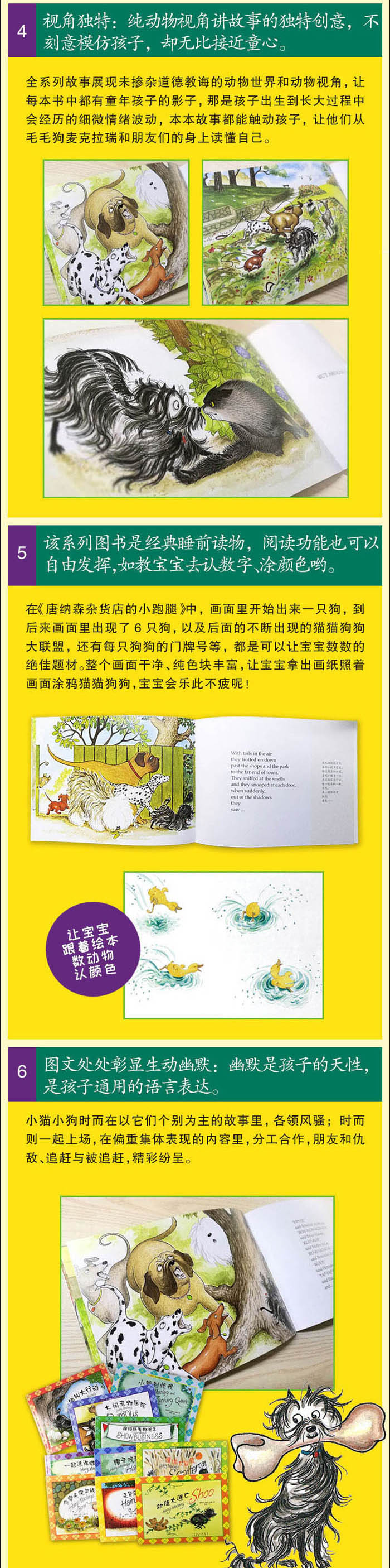 06图文处处彰显生动幽默:幽默是孩子的天性,是孩子通用的语言表达。小猫小狗时而在以它们个别为主的故事里,各领风骚;时而则一起上场,在偏重集体表现的内容里,分工合作,朋友和仇敌、追赶与被追赶,精彩纷呈。