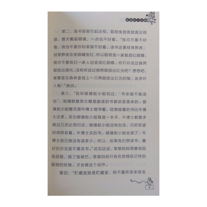 第三,“我听眼镜蛇小姐说过,‘书非借不能读也’,我猜那意思大概是能读的书都该是借来的。眼镜蛇小姐整天跟牛博士借书看,结果她看的书比牛博士还多。因为眼镜蛇小姐每借一本书,牛博士都要求她过几天必须归还,眼镜蛇小姐没有办法,只好抓紧时间拼命看。牛博士买的书,眼镜蛇小姐全读了,牛博士自己倒没有读多少。所以,如果我们想读书,最好的办法是不要买书。”说完这话,笨狼妈妈得意地扭扭屁股,摇了摇尾巴。笨狼妈妈只有在觉得自己特别聪明的时候,才会做这个动作。