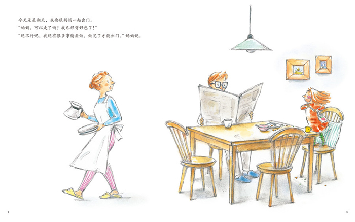 星期天是可以和妈妈一起出门的日子。小女孩从早上开始就特别兴奋,帮助妈妈做了很多家务,虽然对妈妈来说可能并不是帮忙。