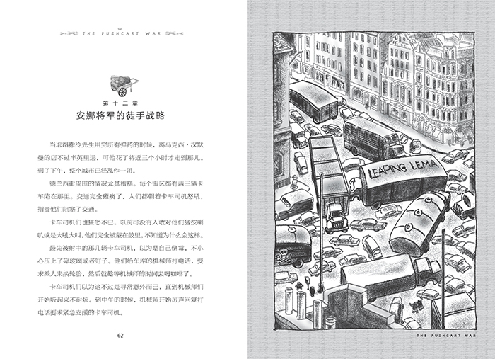 跟世界上大大小小的战争一样,这场战争也有阶段、高潮、转折、结束,也有标志性的事件、会议、约定、谈判,也出现领袖、战争英雄、公众人物,除了正面的“武力”战争,也少不了媒体上的文字战争。最后也会留下丰富的战争遗产,包括作者所写的这本书。这看似是非常严肃的战争,关乎手推车小贩的生死存亡。可是武器豌豆枪一出场,立即就带来了神奇的幽默与讥讽的效果。战争的各个阶段也笑料不断,所有人物的意图、言行无不直接、直白,充满了童趣。作者简•梅里尔是位童心未泯、有些顽皮的儿童文学作家,为了营造一种历史档案研究的感觉,她不仅在书里加入了各种形式的素材,比如日记、会议速记等,还正儿八经地在正文之前加了一篇历史教授康柏利的前言,并写了一篇自序,讲述了自己的写作缘起和意图,还正经地感谢了一堆奇奇怪怪的人。最后你一看落款,日期是2036 年,手推车战争结束10 年之后。为了增加这段“历史”的真实感,她还在书中客串了一个角色,造成亲历历史的假象,细心的你在阅读的时候不妨留心一下。在这场以小博大的战争中,卡车代表强大、权力、金钱、强势;小推车代表弱小、智慧、团结。最后的胜利者是谁呢? 20 世纪60 年代,在纽约喧闹拥挤的格林威治村,我们亲爱的作家简•梅里尔看着那些体型巨大、吵闹、喷着尾气的大卡车,说道,卡车给她的感觉就好像霸凌给每个人的感觉。除却为青少年讲述战争的意图,除却本身欢腾热闹的故事,或许她还想通过这本书告诉你,成长也会遭遇一场场“战争”,如果有一天你遭遇霸凌,请像这些手推车小贩面对大卡车时一样,守住为自己抗争的勇气和智慧!