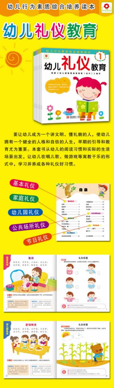 要让幼儿成为一个讲文明、懂礼貌的人,使幼儿拥有一个健全的人格和自信的人生,早期的引导和教育尤为重要。《幼儿礼仪教育(套装共6册)》从幼儿的阅读习惯和实际的生话场景出发,让幼儿在唱儿歌、做游戏等寓教子乐的形式中,学习“基本礼仪”“家庭礼仪”“幼儿园礼仪”“公共场所礼仪”“节日礼仪”五方面的内容,培养幼儿养成各种礼仪好习惯。