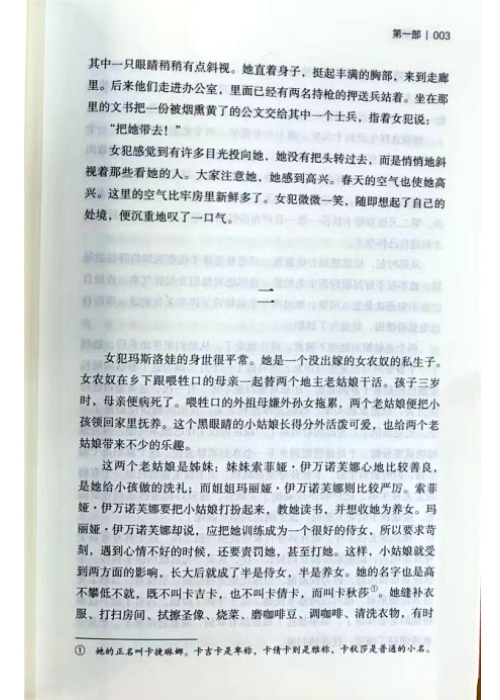 女犯玛斯洛娃的身世很平常。她是一个没出嫁的女农奴的私生子女农奴在乡下跟喂牲口的母亲一起替两个地主老姑娘干活。孩子三岁时,母亲便病死了。喂牲口的外祖母嫌外孙女拖累,两个老姑娘便把小孩领回家里抚养。这个黑眼睛的小姑娘长得分外活泼可爱,也给两个老姑娘带来不少的乐趣。